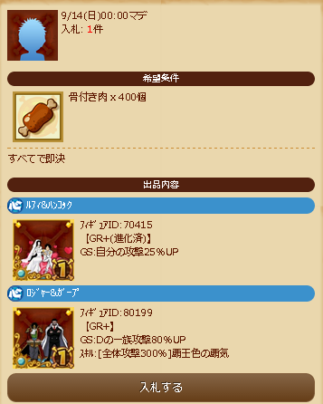 ミホークドフラもかなり価値が低いですが、みかん20で売れた事があったり、2体で肉3になったりということもまだありましたので、まだ肉1で売れる可能性もありそう・・・。
